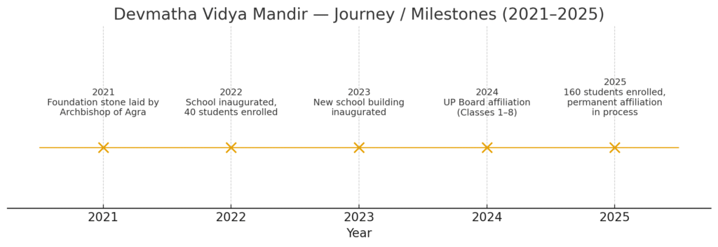 Devmatha Vidya Mandir, founded in 2021 by the Etawah Mission, is committed to providing affordable, value-based, and quality education to the children of Nagla Gadarian and nearby villages. Starting with just 40 students in 2022, the school today nurtures 160 students from Nursery to Class 5, steadily growing as a beacon of hope and learning for the community.